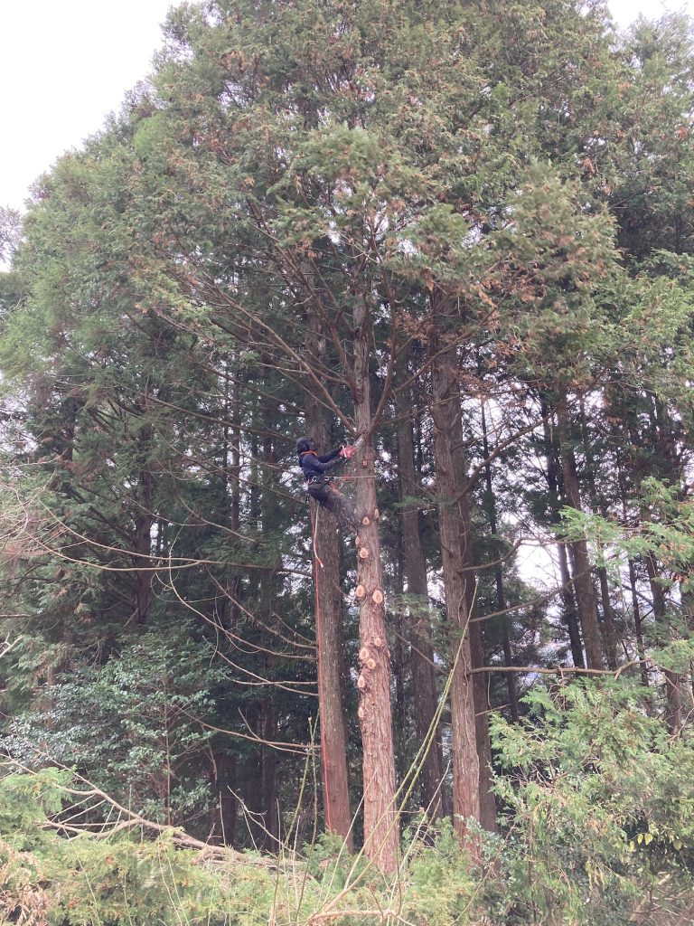 この日初めて樹上でチェーンソーを使い、低い木でトップカットから玉切りもしたところ、色々改善点が見えてきました。