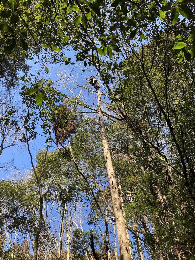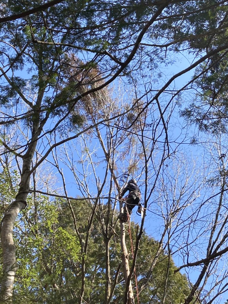 細く歪で樹高も意外と高く、木々を突き抜け20メートル近くある。それでも、今回のケースは、登らず伐り倒す方が予測不可能なことが多く大掛かりになり、かえって危険と判断。