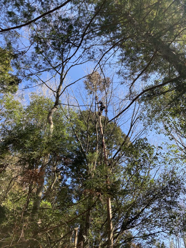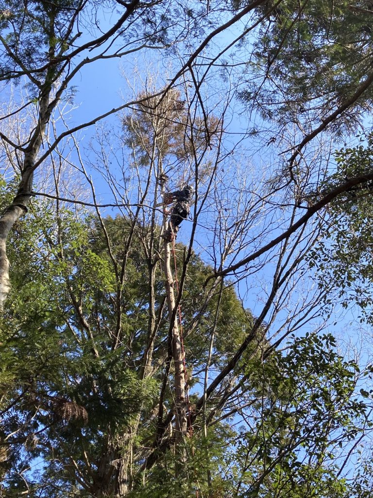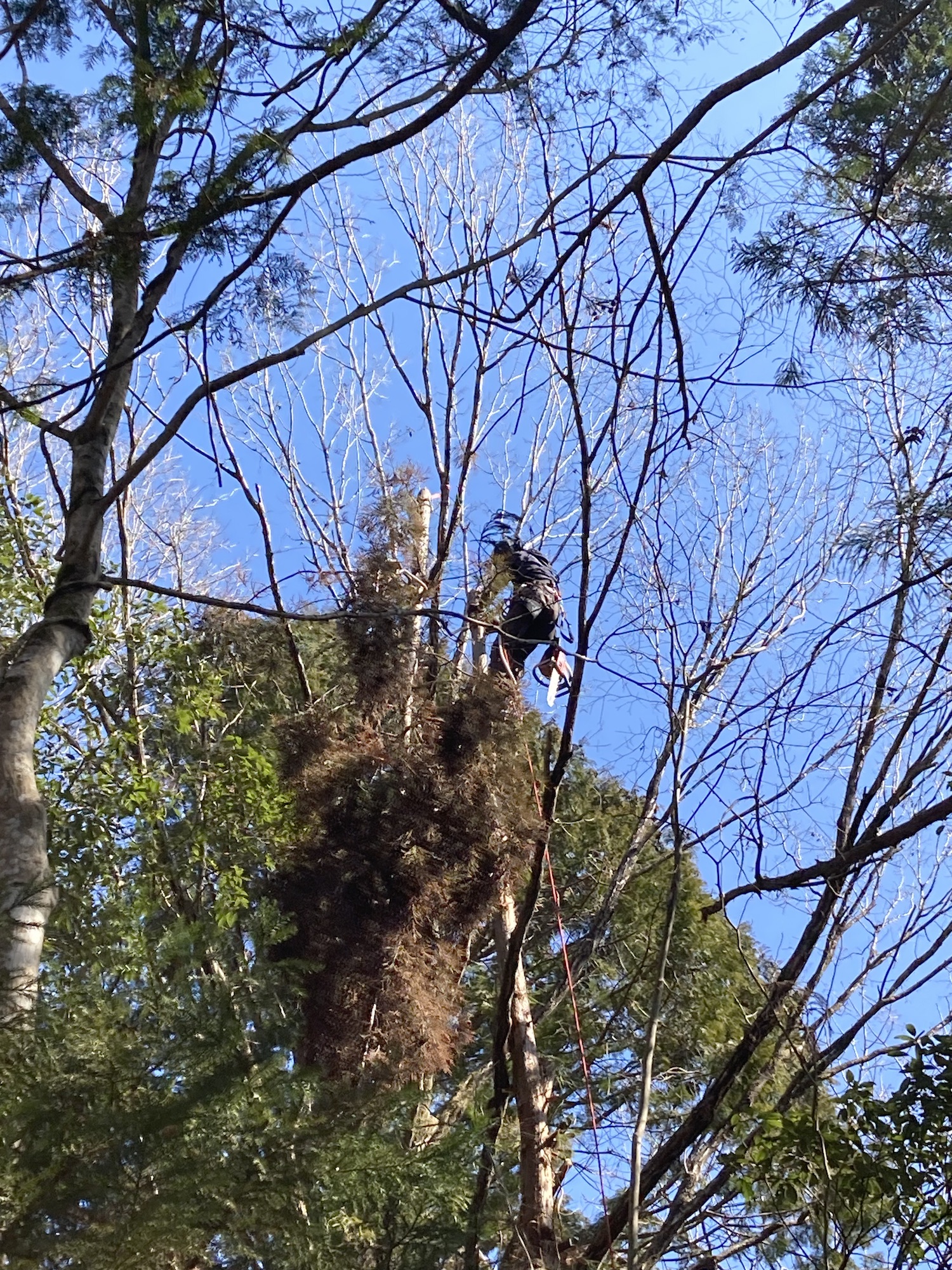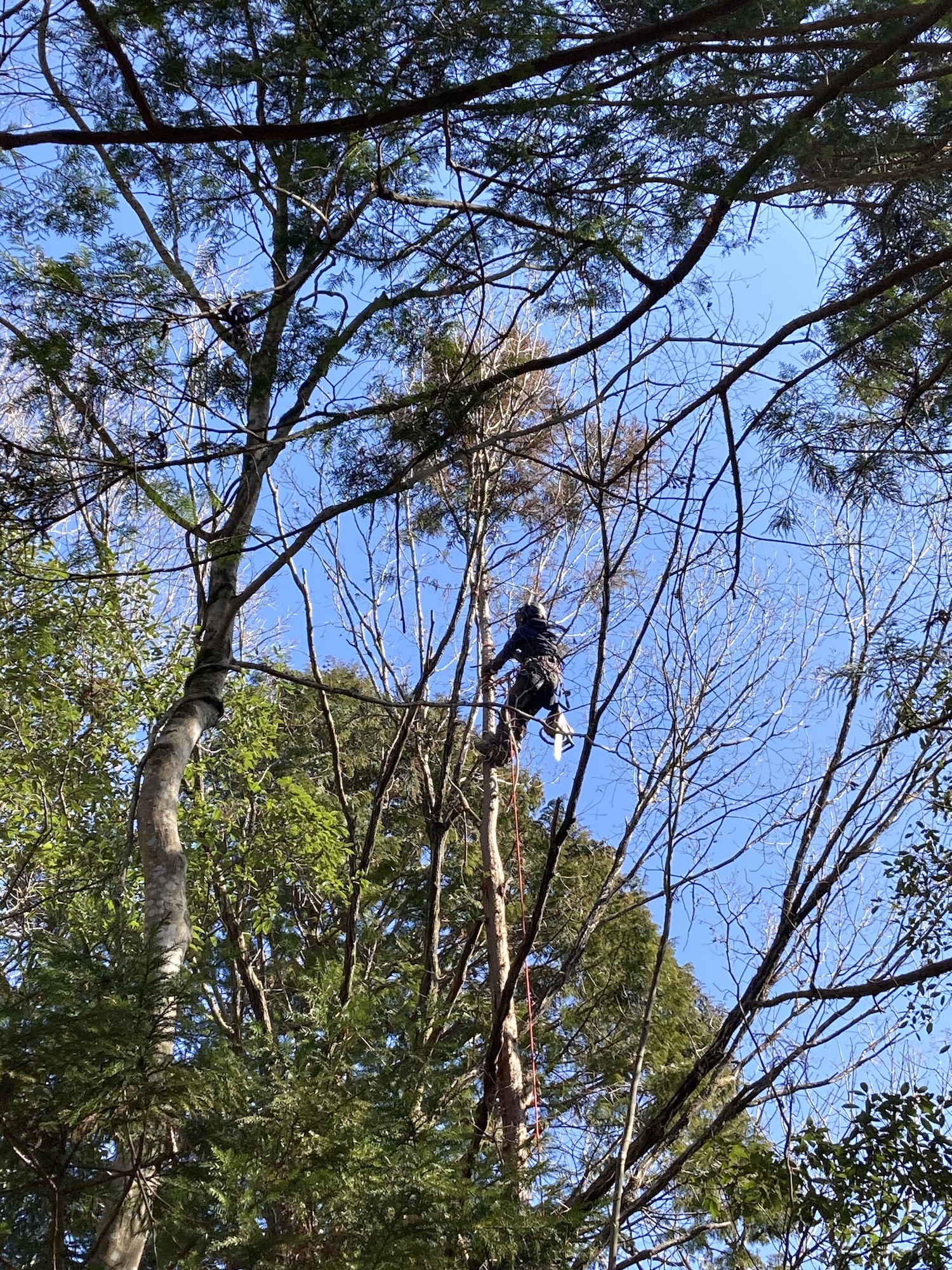 細く歪で樹高も意外と高く、木々を突き抜け20メートル近くある。それでも、今回のケースは、登らず伐り倒す方が予測不可能なことが多く大掛かりになり、かえって危険と判断。