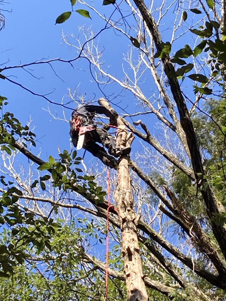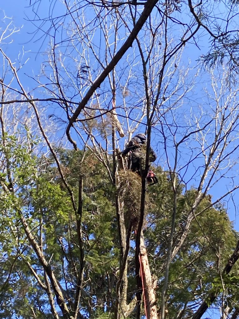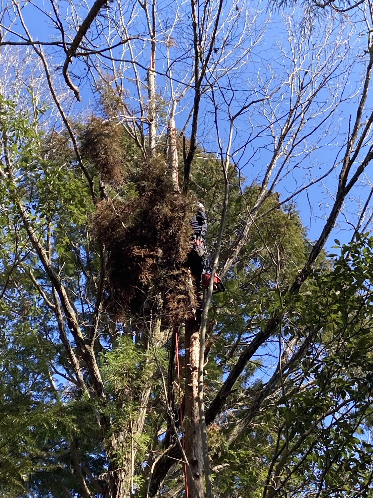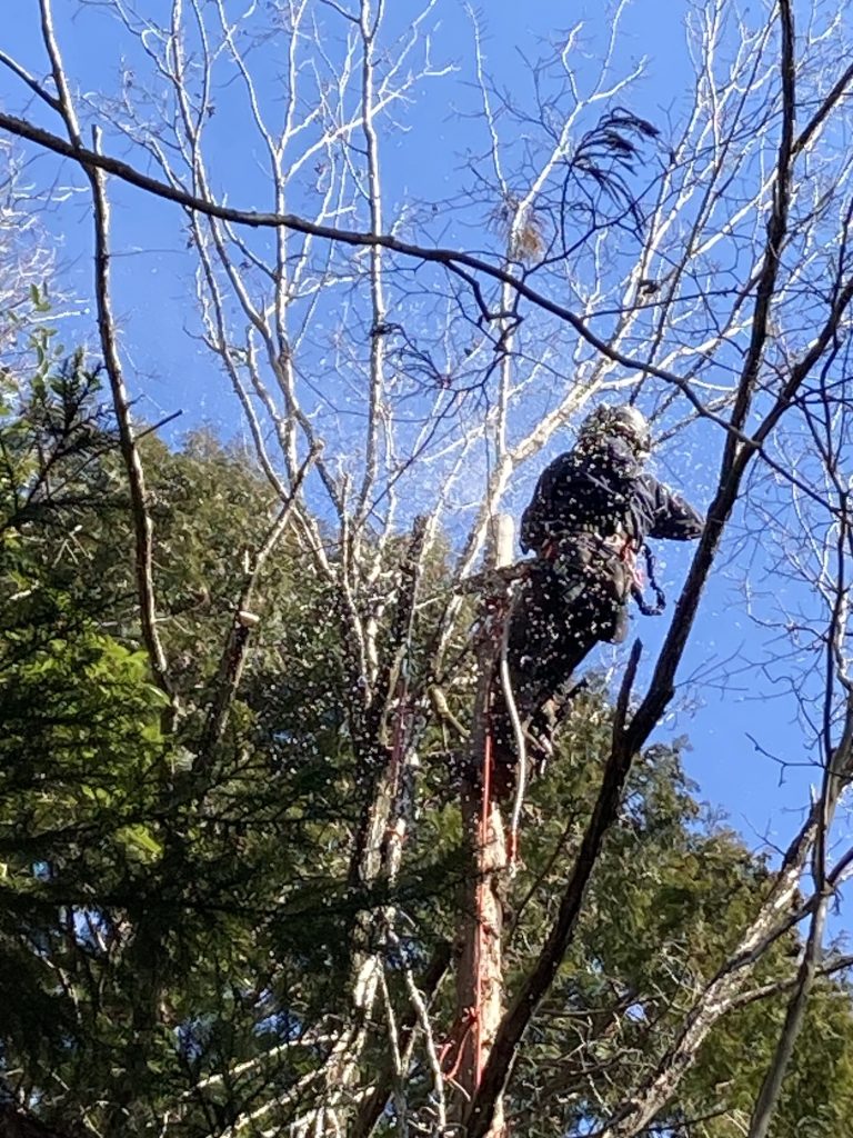 細く歪で樹高も意外と高く、木々を突き抜け20メートル近くある。それでも、今回のケースは、登らず伐り倒す方が予測不可能なことが多く大掛かりになり、かえって危険と判断。
