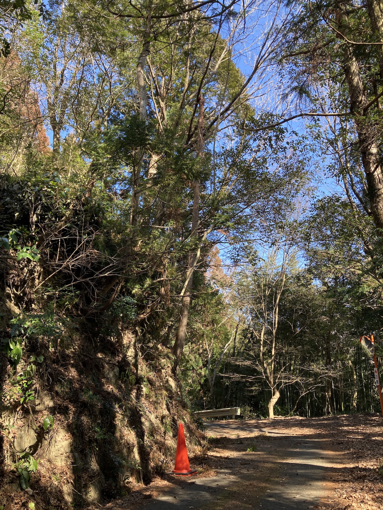 道上の崖に生えた支障木を伐ります。この並びの3本目。「伐り落とし」で道に落ちないようにします。前日に枝を打ちましたが、隣の栗の木(楢の木かも)が樹幹に干渉し、いじけたところが股になって梢が複数出ており、吊るして処理するのに手間がかかりました。2時間ほど樹上にいて、その日はすでに4本登っていたこともあって集中力も体力もいよいよ限界、メインロープをそのままに、日を改めることにしました。そして2日目。