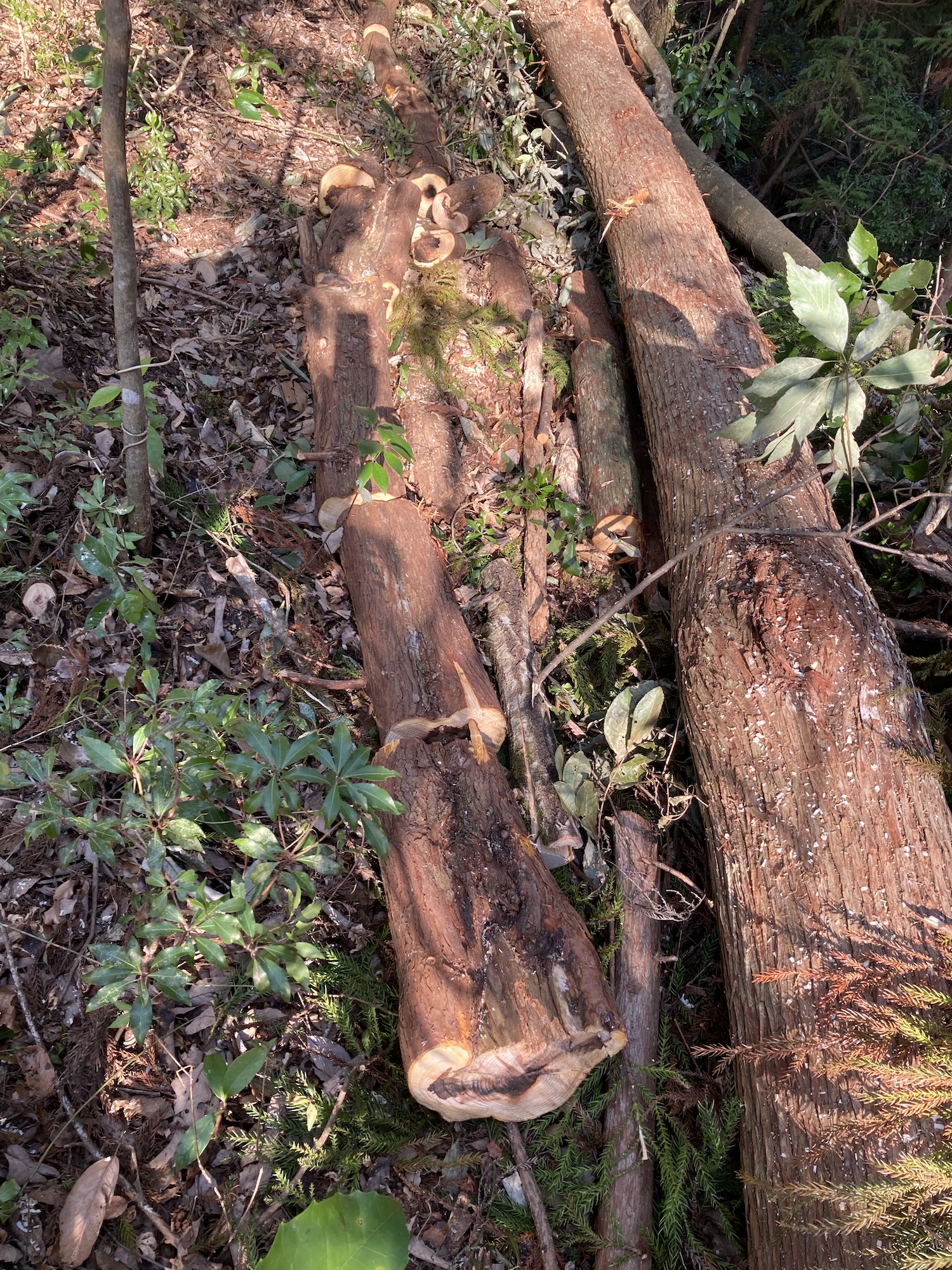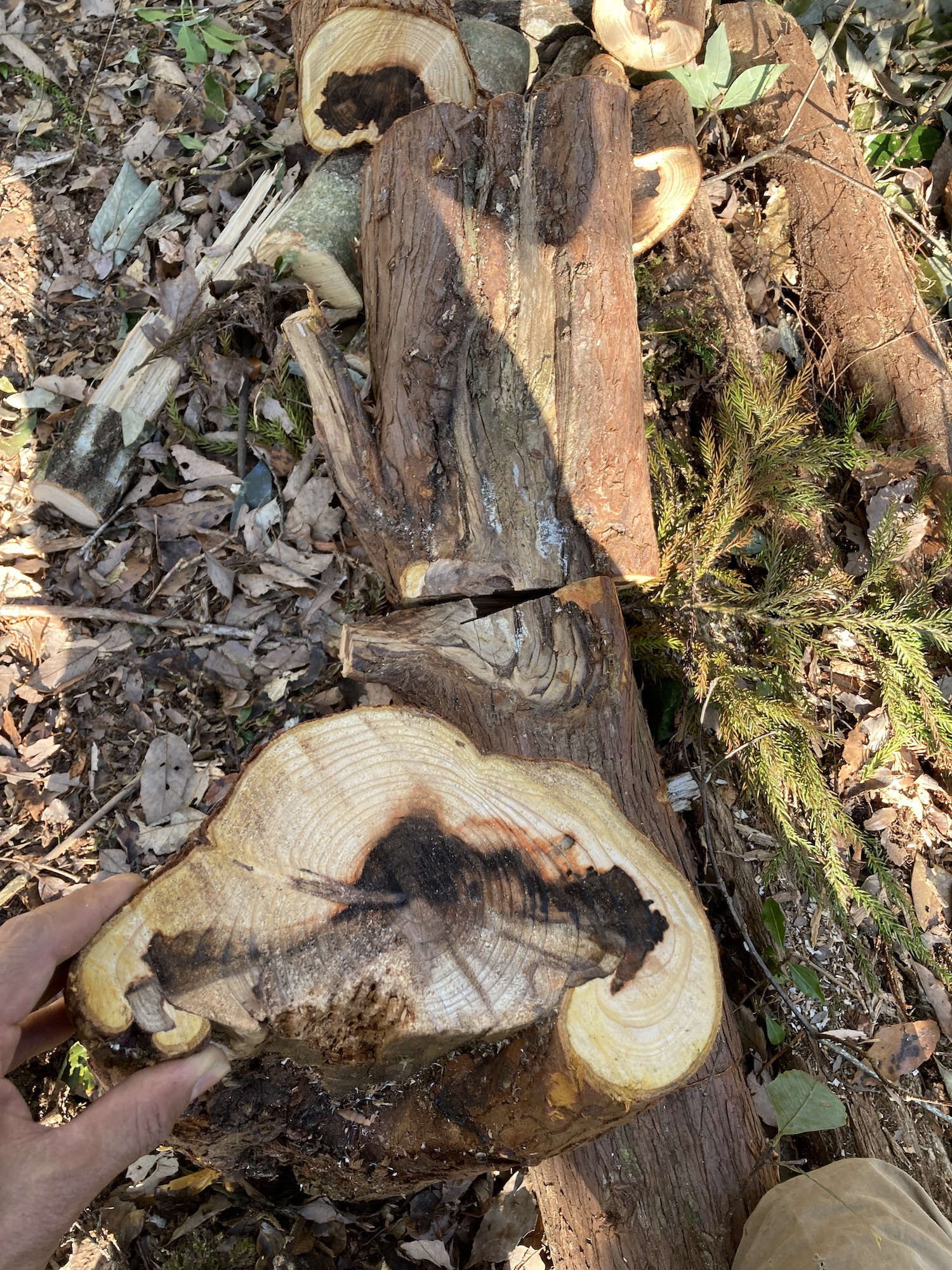 伐り落としたものを順に並べてみます。幹の中ほどとその少し上の2箇所。